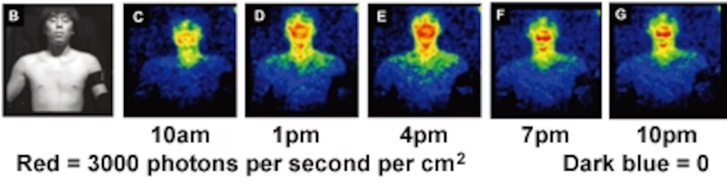 Kobayashi, M., Kikuchi, D., & Okamura, H. (2009). Imaging of ultraweak spontaneous photon emission from human body displaying diurnal rhythm. PLoS ONE, 4(7), e6256.
