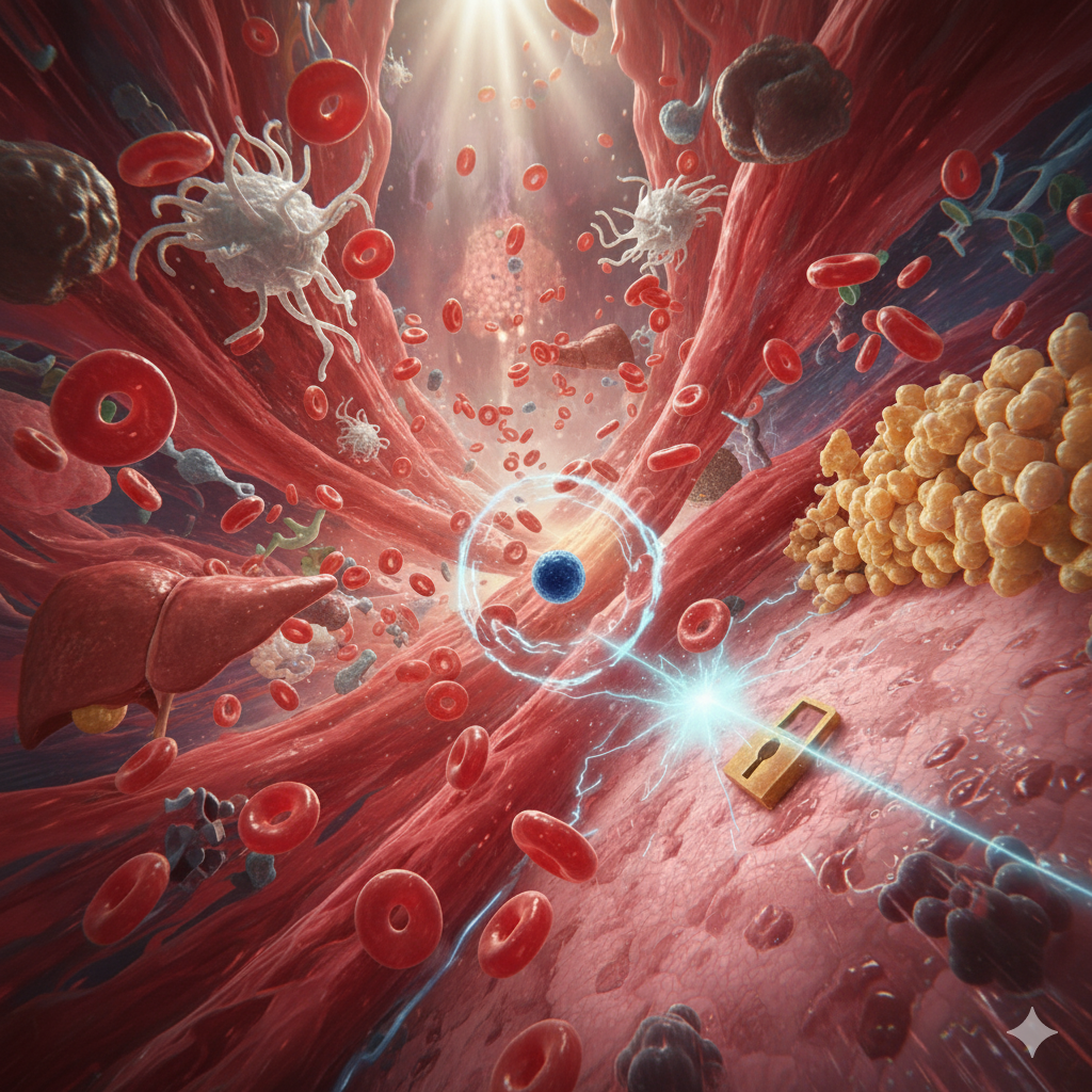 คุณอาจจินตนาการว่ากระแสเลือดไหลเอื่อยๆ เหมือนแม่น้ำเจ้าพระยายาวเย็น แต่ความเป็นจริงนั้นโหดร้ายกว่าจินตนาการนับร้อยเท่า “ระบบหมุนเวียนโลหิต” (Systemic Circulation) คือมหาสมุทรอันบ้าคลั่งที่ถูกปั่นป่วนด้วยปั๊มน้ำขนาดยักษ์ที่เรียกว่า “หัวใจ” ตลอด 24 ชั่วโมง ทันทีที่เอเจนต์-เอ็กซ์หลุดเข้ามา เขาถูกแรงดันมหาศาลกระแทกจนหมุนคว้าง รอบตัวเขาเต็มไปด้วยเม็ดเลือดแดงที่วิ่งชนกันอุตลุด เม็ดเลือดขาวขนาดมหึมาที่ลอยตัวเหมือนยานรบ และเกล็ดเลือดที่พร้อมจะก่อตัวเป็นกำแพงสกัดกั้น เสียงหวีดหวิวของกระแสเลือดดังสนั่นหวั่นไหวราวกับเสียงพายุไต้ฝุ่น ท่ามกลางความโกลาหลนั้น ความจริงที่น่าสะพรึงกลัวที่สุดเปิดเผยออกมา… เอเจนต์-เอ็กซ์ ไม่มีดวงตา เขาไม่มีแผนที่ ไม่มี GPS นำทาง และไม่มีสมองกลฝังอยู่ เขาคือ “ยาตาบอดสนิท” ที่ลอยคออยู่กลางมหาสมุทรเลือด เขาไม่รู้ด้วยซ้ำว่าภารกิจของเขาอยู่ที่ไหน เขาถูกเหวี่ยงไปตามกระแสธารที่เชี่ยวกราก กระจายไปทุกทิศทาง ตั้งแต่เส้นเลือดฝอยบนหนังศีรษะ ไปจนถึงปลายเล็บขบ “เป้าหมายอยู่ที่ไหน?” เสียงสะท้อนในระดับพันธะเคมีกรีดร้อง เขาถูกพัดผ่าน “ตับ” โรงงานกำจัดพิษขนาดใหญ่ เซลล์ตับพยายามจะทำลายเขา แต่เขาหลุดรอดมาได้ เขาไหลผ่าน “ไต” เครื่องกรองน้ำเสียที่พร้อมจะขับเขาออกไปทางปัสสาวะ เขาไหลผ่าน “ผิวหนัง” ผ่านเซลล์กล้ามเนื้อน่อง ผ่านกระดูก…ทุกครั้งที่เขาเฉียดเข้าใกล้เซลล์เหล่านั้น เขาพยายามจะ “ทักทาย” เอเจนต์-เอ็กซ์ เอาโครงสร้างโมเลกุลของเขากระแทกเข้ากับผนังเซลล์นิ้วโป้งเท้า …ปัง!… เงียบกริบ ไม่มีการตอบรับ ผนังเซลล์นิ้วเท้ามี “แม่กุญแจ” (Receptor) ฝังอยู่ก็จริง แต่มันเป็นแม่กุญแจทรงเหลี่ยม ในขณะที่ส่วนหัวของเอเจนต์-เอ็กซ์ เป็นทรงกลม แรงผลักทางไฟฟ้าดีดเขากระเด็นออกมาทันที นี่คือกฎเหล็กแห่งจักรวาล: No Fit, No Reaction (หากเข้ากันไม่ได้ ก็ไม่มีอะไรเกิดขึ้น) เขาจึงเป็นเพียงวิญญาณเร่ร่อนที่ปลอดภัยต่อเซลล์เหล่านั้น เพราะเขา “เพิกเฉย” ต่อพวกมัน และพวกมันก็เพิกเฉยต่อเขา