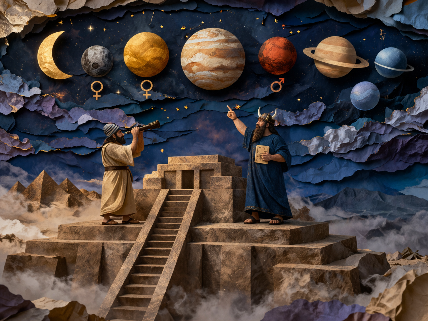 สิ่งที่น่าทึ่งที่สุดคือ วัฒนธรรมที่ไม่เคยติดต่อกันก็ผูกดาวกับวันไว้เหมือนกัน ทุกอารยธรรมโบราณ ตั้งแต่บาบิโลนถึงอินเดียถึงจีน ล้วนมองเห็นเทห์ฟากฟ้าเจ็ดดวงสว่างดวงเดียวกัน ชาวอินเดียเช่นเดียวกับชาวบาบิโลน สังเกตท้องฟ้ายามค่ำคืนอย่างพิถีพิถัน ติดตามดาวเคราะห์เหล่านี้มาหลายศตวรรษ Medium